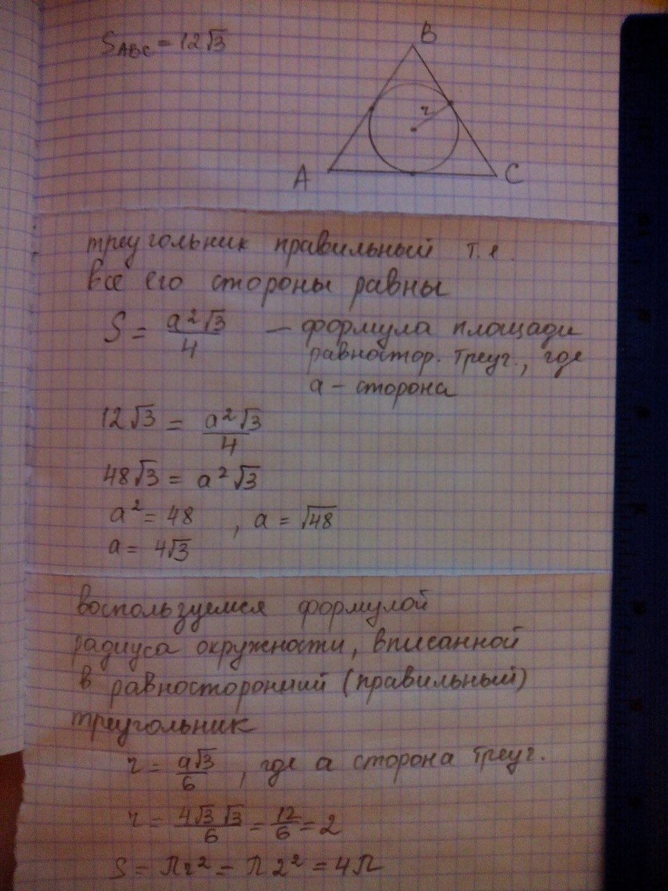 Площадь правильного треугольника равна 12√3 см². Найти площадь вписанного в этот треугольник круга.