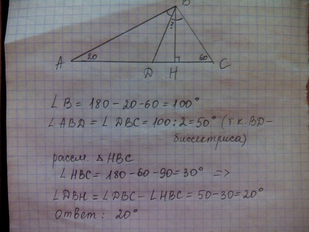 в треугольнике АВС углы А и С равны 20° и 60° соответственно. найдите угол между высотой ВН и биссектрисой ВД