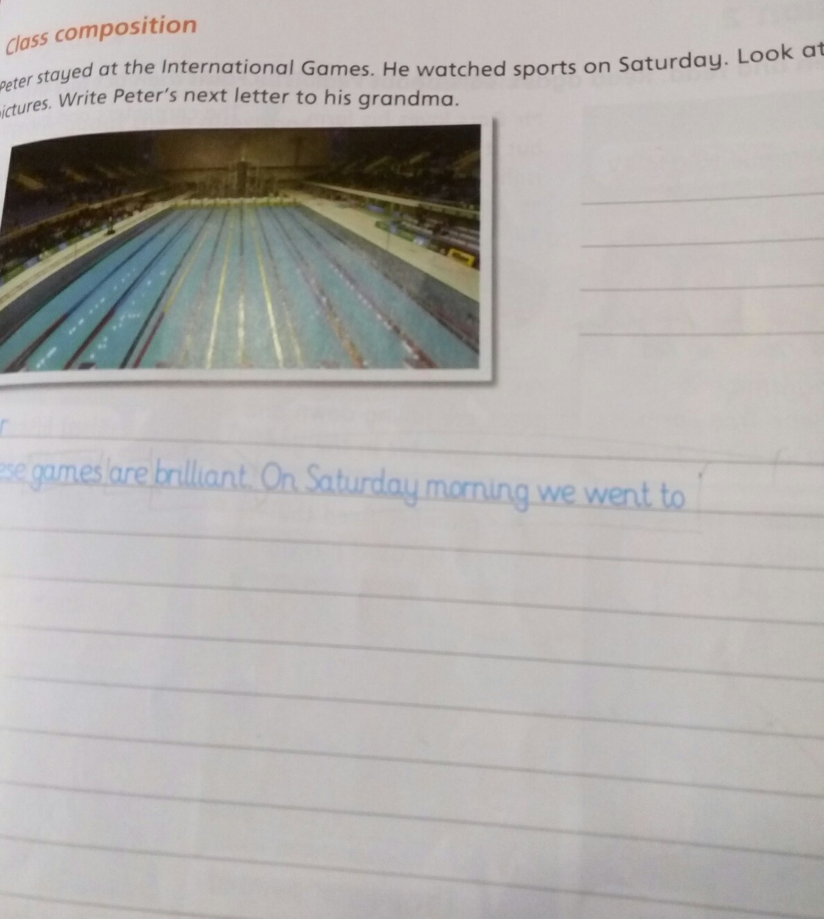 On saturday morning we went to the swiming pool. There were all our family members: my father,mother,grandmother, grandfather snd me in that place. It was the best holiday in my live! I swimed and played with children in the pool. My mum and dad drank tee and ate sweets. My granny looked for me. And my grandfather read newspaper. I had a lot of fun and parents,grandparents too!