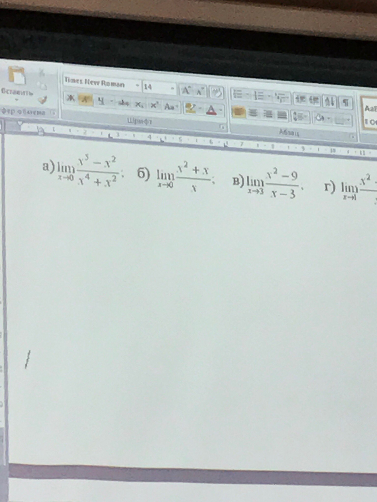 lim_{x to 0} { x^3-x^2over x^4+x^2}=lim_{xto 0}{x-1over x^2+1}=-1\\lim_{xto0}{x^2+xover x}=lim_{xto0}{x+1}=1\\lim_{xto3}{x^2-9over x-3}=lim_{xto3}{x+3}=6