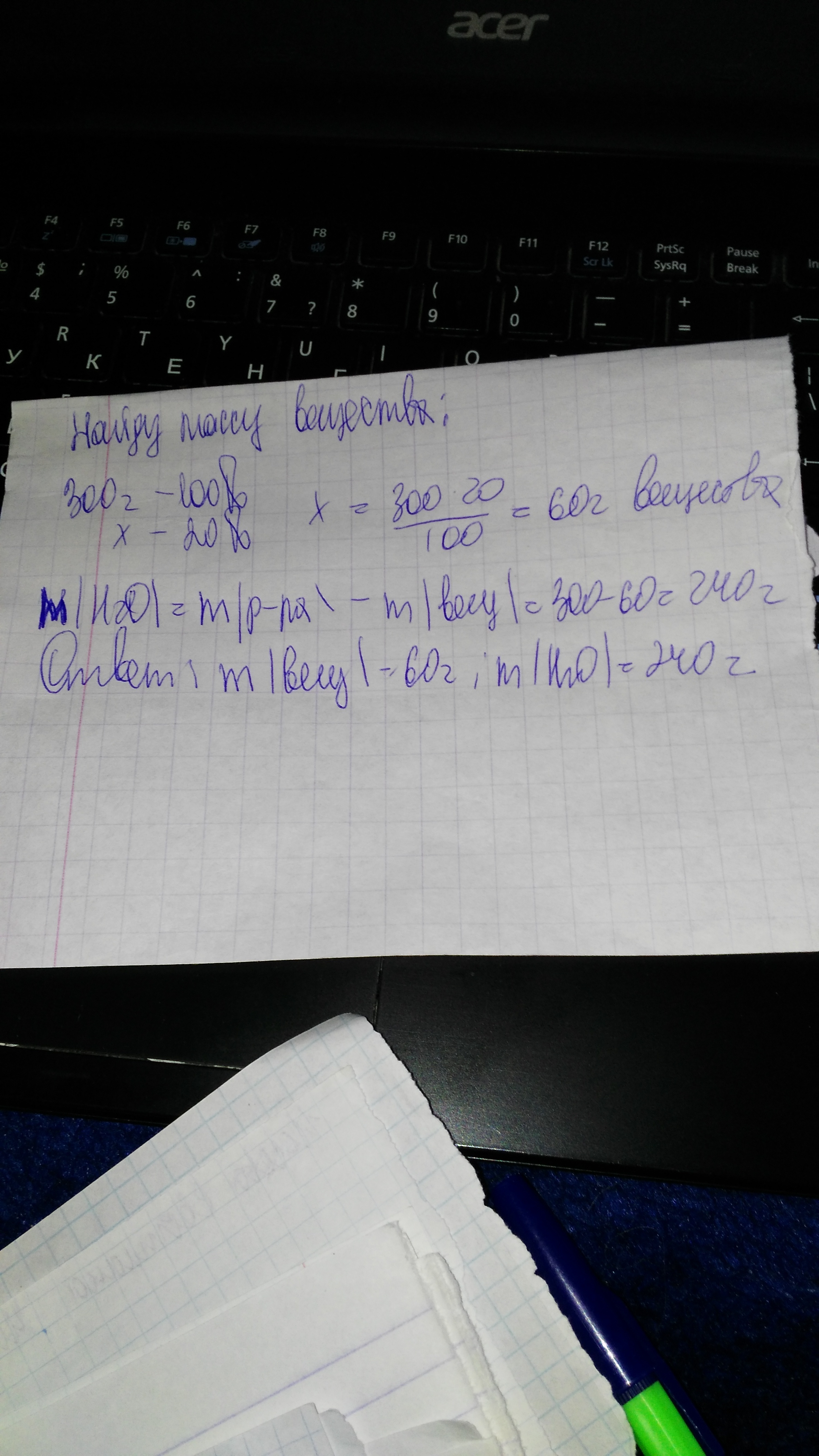 Масса раствора -- 300 г, что составляет 100%. Массовая доля вещества нам известна -- 20%, массовая доля воды равна 100%-20%=80%