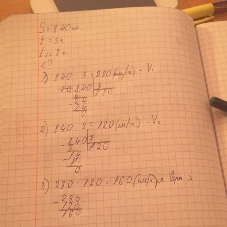 Помоги вертолет пролетает 840 км за 3 часа, а автомобиль проходит это же расстояние за 7 часов. чья скорость больше и на сколько? в столбик если можно