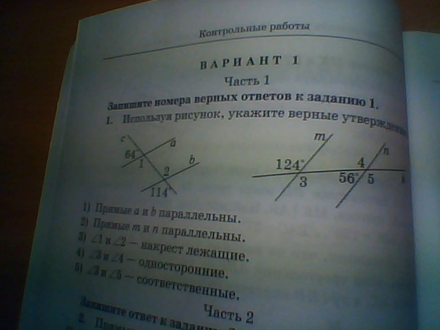 Используя рисунок, укажите верные утверждения: 1) Прямые a и b паралельны. 2) Прямые m и n паралельны. 3) угол 1 и угол 2 - накрест лежащие. 4) угол 3 и угол 4 - односторанние. 5) угол 3 и угол 5 - соответственные.