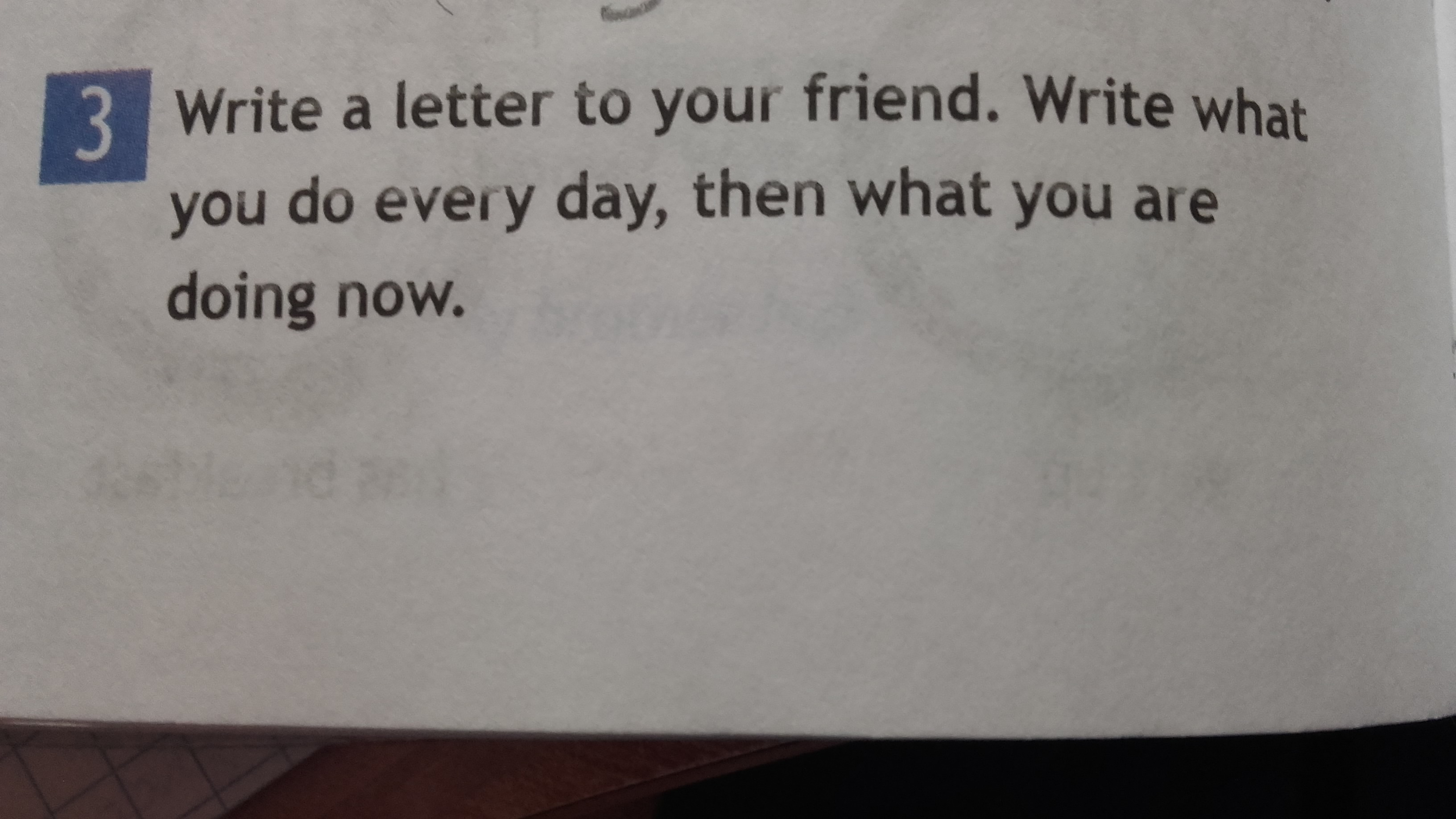 Hello, my friend! I ususally wake up at 7 o'clock. After waking up, I take a shower and get dressed.Afterwards,I eat breakfast and I surf on the internet.I communicate with friends via social networks,like facebook,check my e-mails or read articles. Then I go to school. When I finish at 1 o'clock I return home and I eat lunch.Usually I watch television after lunch.In the afternoon I sometimes go for a walk,but I usually have some coffee with my friends.Then I return home.The most common thing that I do is to see a movie. After that,I sleep at 11 o'clock the latest.This is my everyday routine. Now, I write a letter to you, my friend, because I want you to know what I doing every day. I hope, you will write letter about your routine.