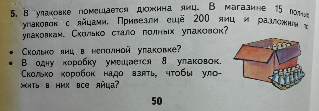Нужно взять 4 коробки. 3 из них будут полными, в четвёртой будет 4 упаковки.