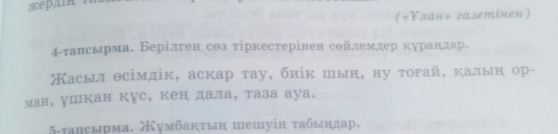1.Әр үйде жасыл өсімдік бар.2.Жолында асқар тау тұрса да, топ жарып өтетін сияқты.3.Биік шыңға міну өте қиын.4.Негізінде ну тоғайда көп өсімдік өседі.5.Қалың орманда ағаш өте көп болады.6.Анау ұшқан құсты көрдің бе ?7.Кең далада асыр салып ойнаған қандай күшті.8.Таза ауа-денсаулық кепілі.