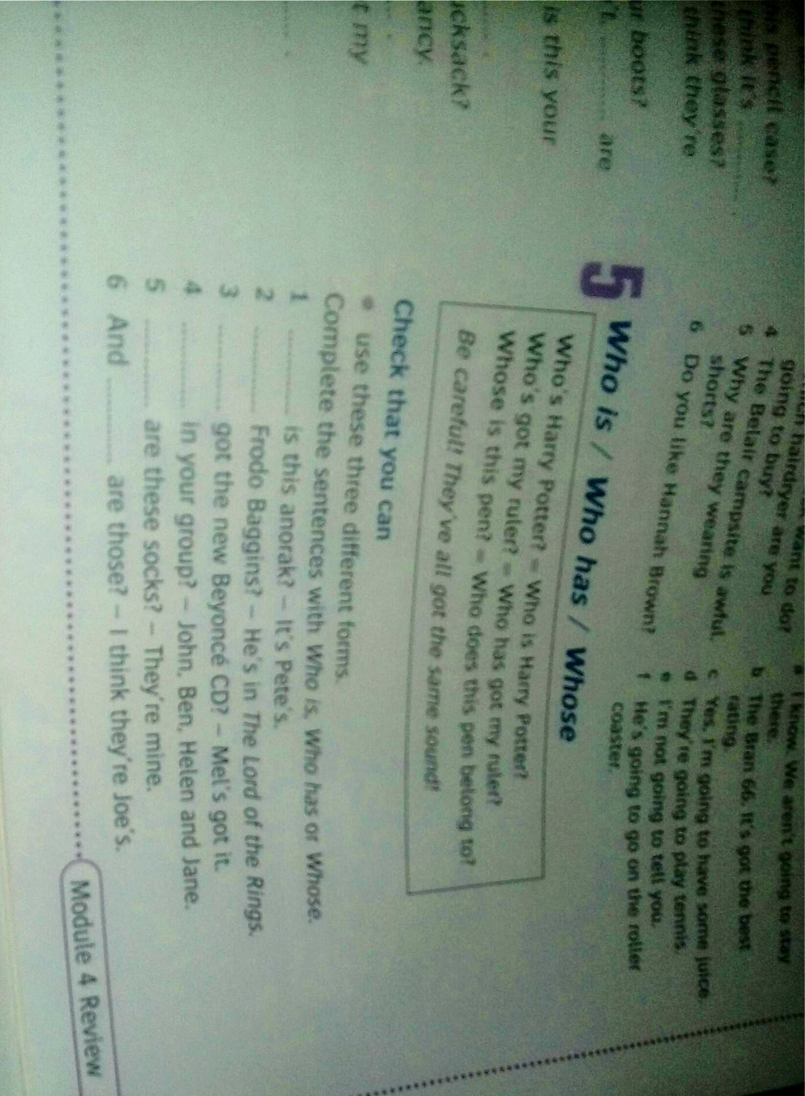 1. whose is this anorak? - it's Pete's 2.who's Frodo Baggins ? .... 3. who's got ...4.who's (who is ) 5. whose 6.whose .