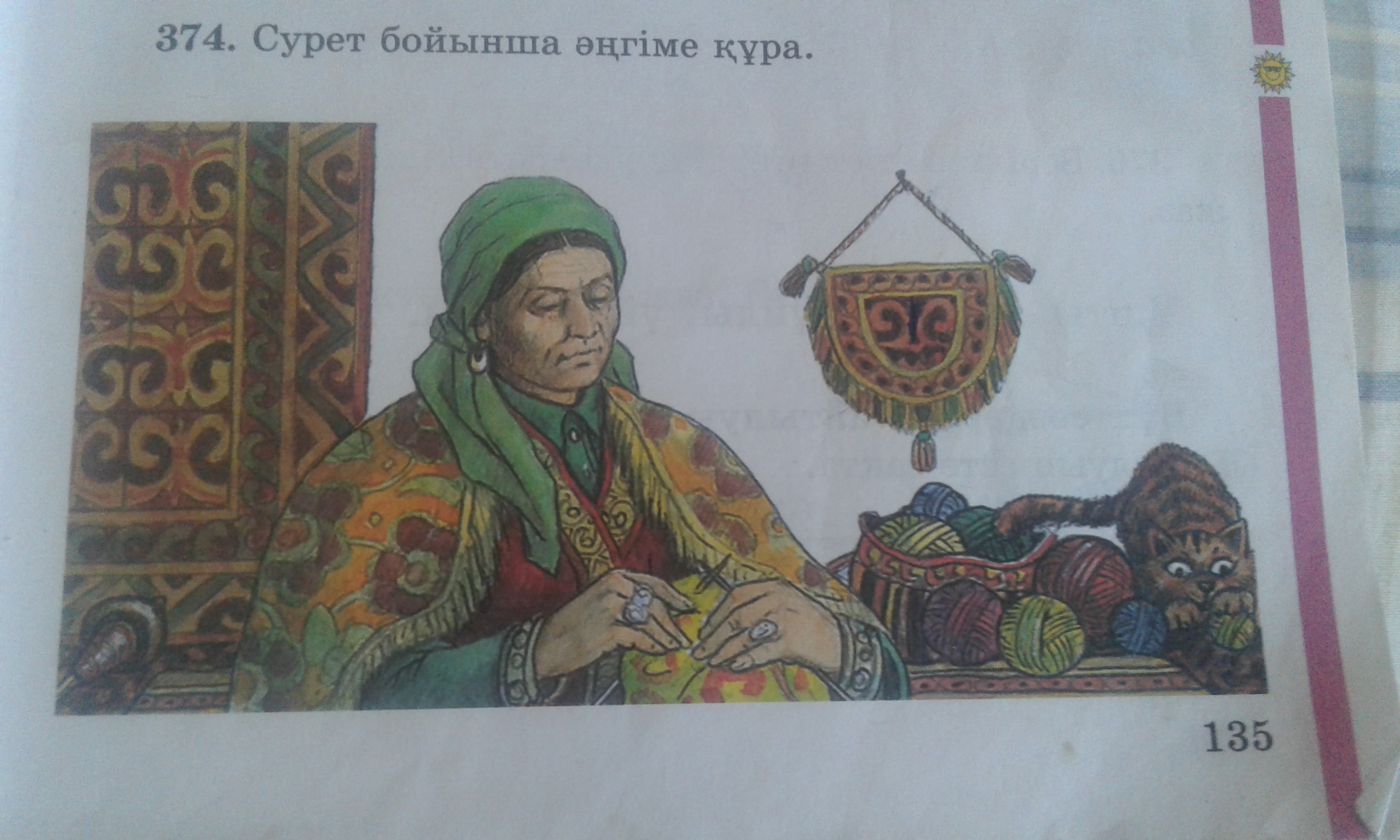 Менің әжемнің қолынан бәрі келеді. Кілем, алаша тоқиды. Оларға салған ою- өрнектері сан-алуан. Ол бізге қолғап, кеудеуше, шұлық тоқып береді. Менің әжем өздеріңіз суретте көріп отырғандай өте сұлу, мейірімді. Мен оның бос отырғанын ешқашан көрген емеспін. Мына суреттегі кілем, қолдорба, әжемнің иығындағы орамал бәрі әжемнің еңбегі. Мынау жіптерді өзі жүнді түтіп, иіріп дайындаған. Ерке мысығым әркезде әжемнің қасында.