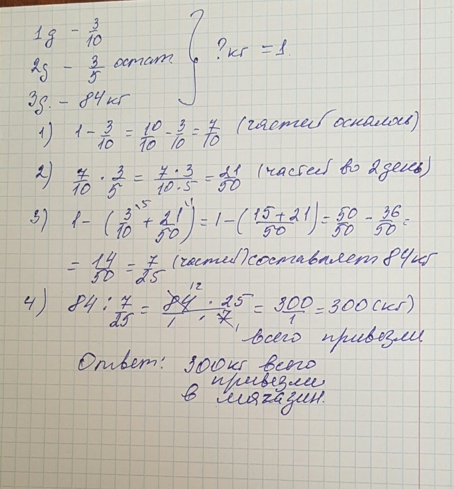 В магазин привезли овощи 1 день продали три десятых овощей во 2 день три пятых остатка в третий день остальныйе 84 кг. сколько всего овощей привезли в магазин?