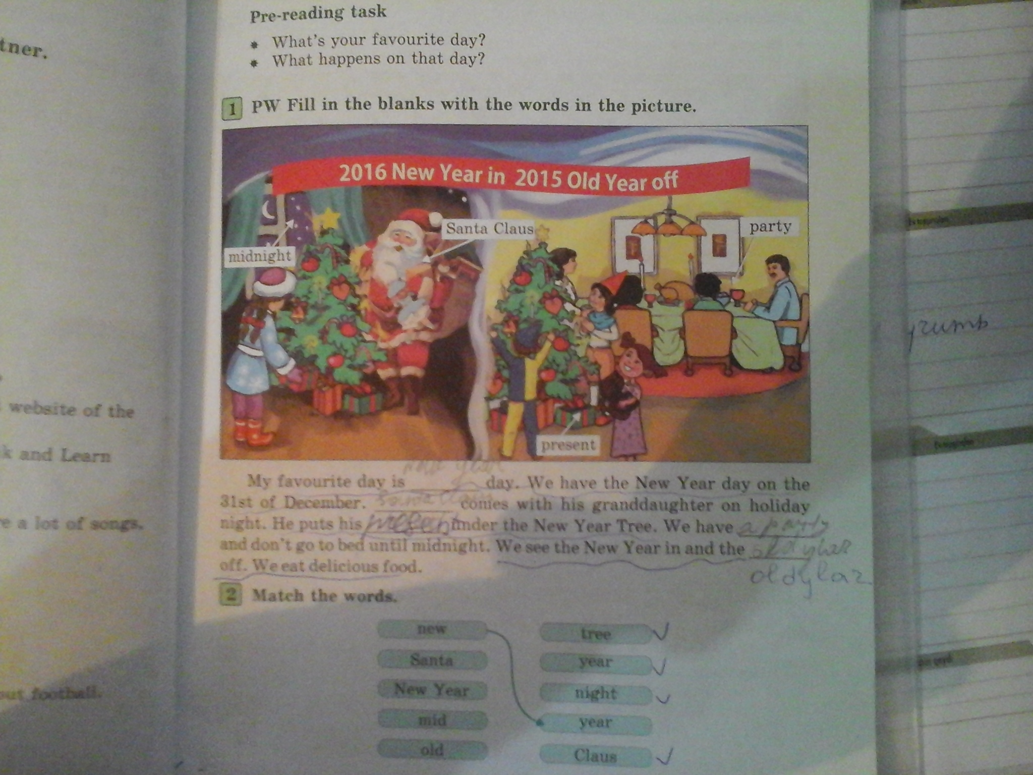 Мой любимый день – Новый год. Мы отмечаем Новый год 31-ого декабря. Санта-Клаус появляется со своей внучкой в праздничную ночь. Он кладет подарки под новогоднюю елку. Мы устраиваем вечеринку и не ложимся спать до полуночи. Мы наблюдаем затем, как наступает Новый год и уходит Старый. Мы кушаем вкусную еду.