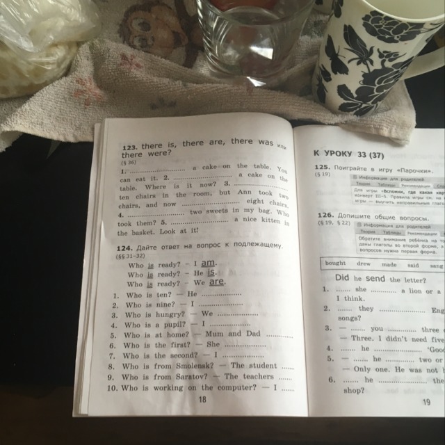 123. 1) (There is) a cake on the table. You can eat it. 2) (There was) a cake on the table. Where is it now? 3) (There were) ten chairs in the room, but Ann took two chairs, and now (there are) eight chairs. 4) (There were) two sweets in my bag. Who took them? 5) (There is) a nice kitten in the basket. Look at it!