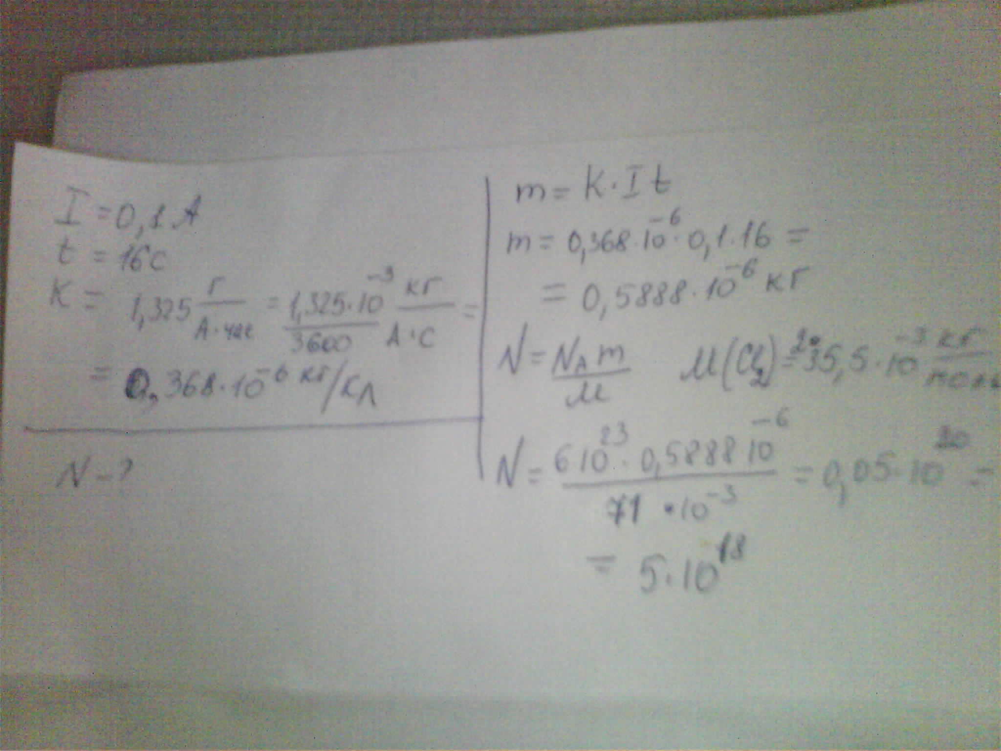Сколько молекул хлора выделится при пропускании через раствор хлористого водорода НCl тока силой 100 мА в течении 16 с?