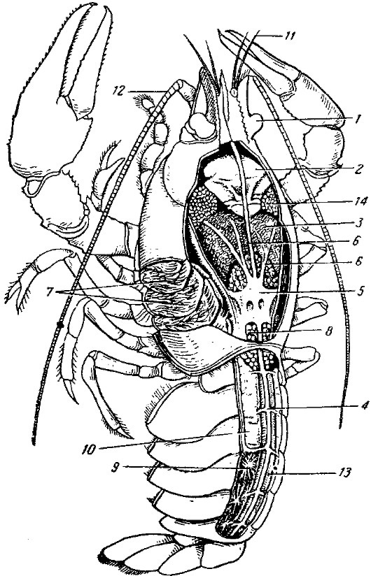 что изображено на рисунке под цифрой 5 : 1)желудок 2)сердце 3)жабры 4)зелёная железа?