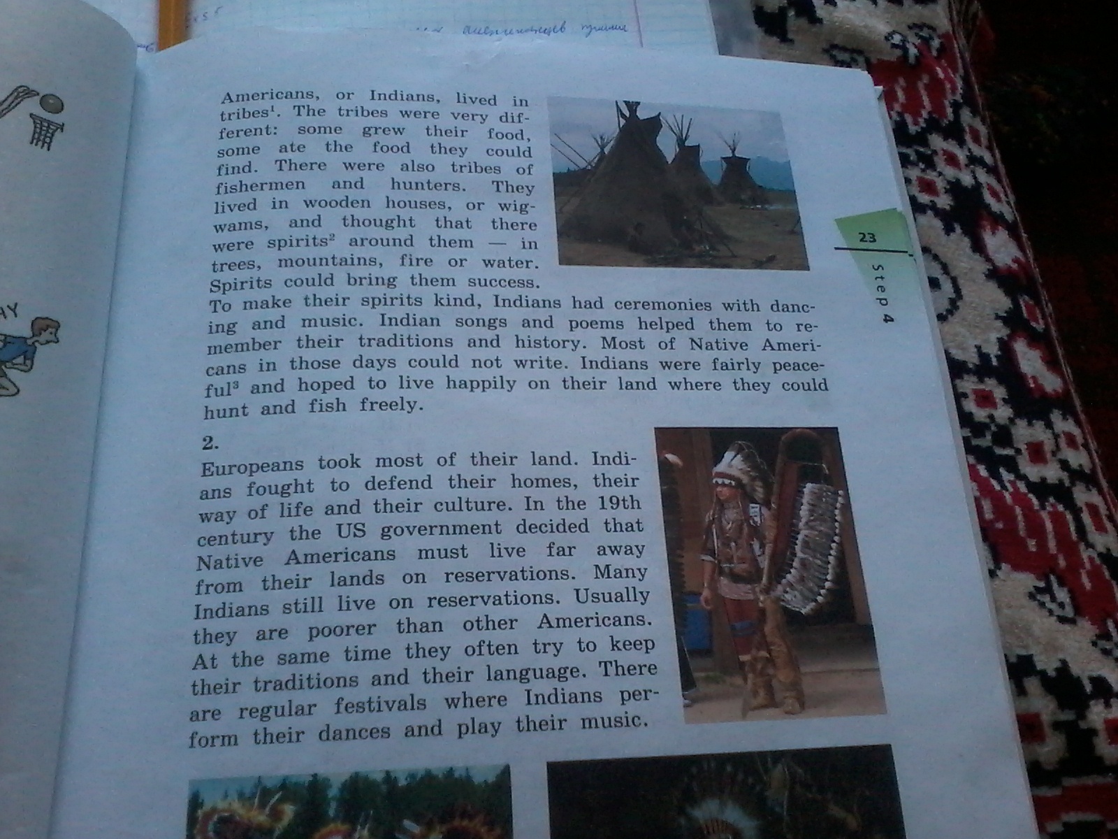 Европейцы взяли большую часть их земли. Индейцы боролись за то, чтобы защитить свои дома, свой стиль жизни и свою культуру. В 19-ом веке правительство Соединенных Штатов решило, что коренные американцы должны жить далеко от их земель в резервациях (заповедниках, отдаленных районах???). Многие индейцы до сих пор живут в резервациях. Обычно они беднее чем другие американцы. В то же время они часто пытаются сохранить свои традиции и свой язык. Здесь проходят постоянные фестивали, где индейцы показывают свои танцы и играют свою музыку.