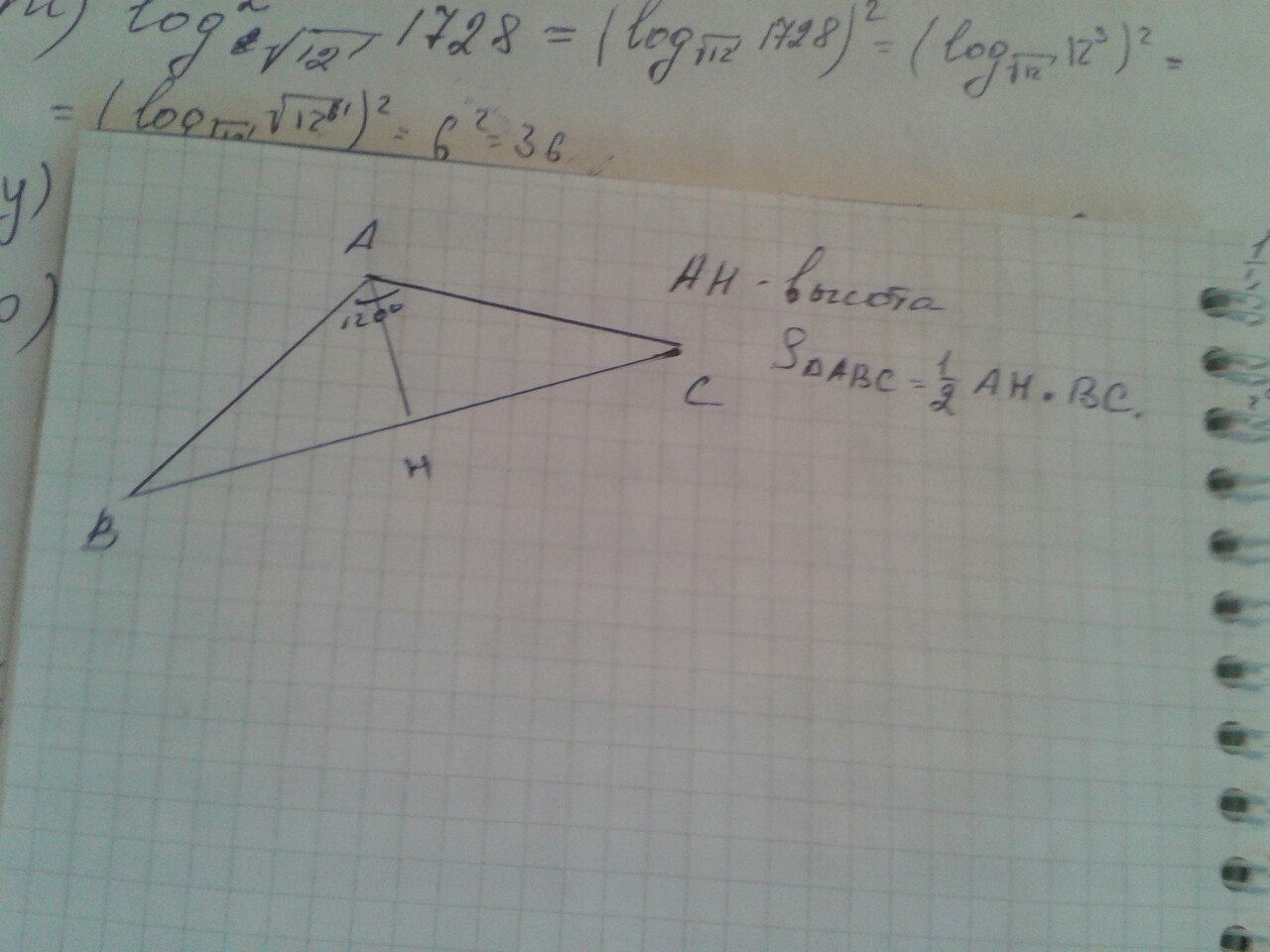 постройте треугольник ABC с углом A 120 градусов. Из вершины А проведите высоту и вычислите площадь треугольника