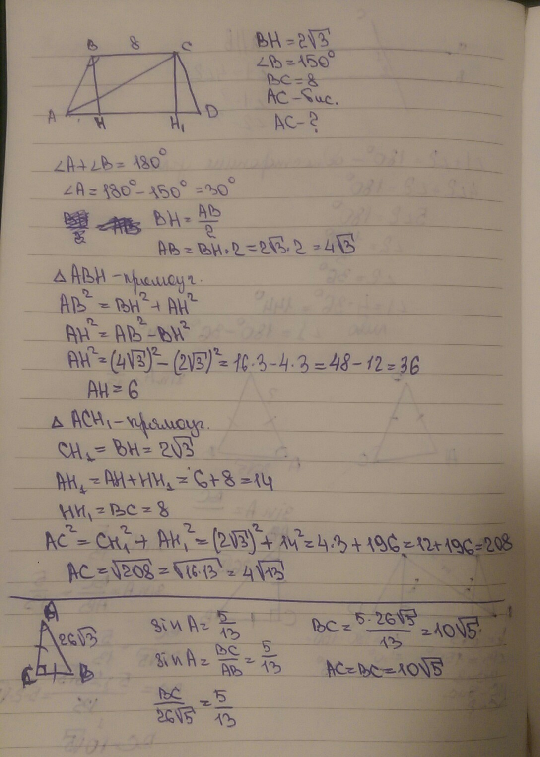 2) Высота трапеции АВСД-2корень из 3, а тупой угол= 150 градусов , ВС=8, АС-биссектриса, Найти АС-?