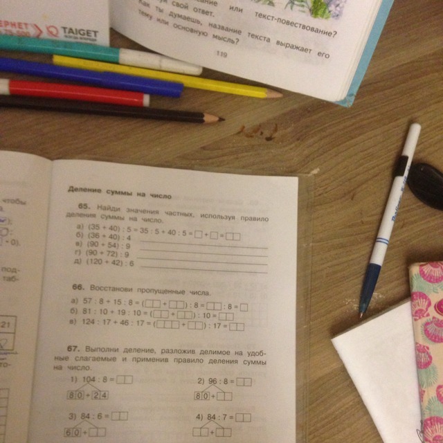 65)а = 19; 36:4=9; 40:4=10;10+9=19 б)=16;90:9=10;54:9=6;6+10=16 в)=18; 90:9=10;72:9=8;8+10=18. д)=27;120:6=20;42:6=7;20+7=27