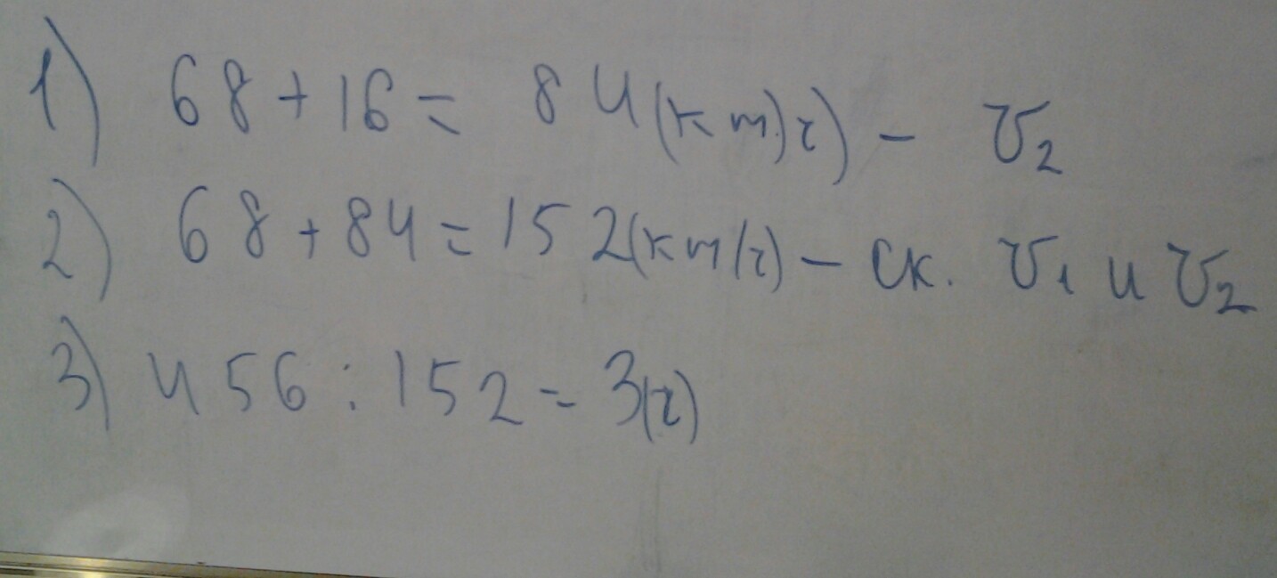 два автомобиля одновременно выезжают навстречу друг другу Из двух городов расстояние между которыми 456 километров скорость первого автомобиля 68 км ч а второго второго на 16 километров час больше Через сколько часов они встретятся