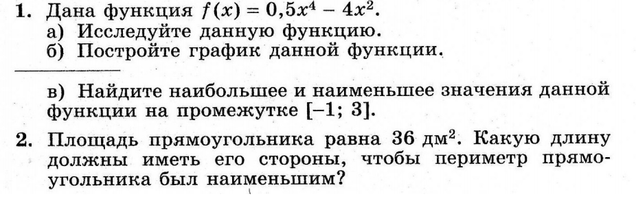 f(-x)=0.5(-x)⁴- 4 (-x)²=0.5x⁴-4x²=f(x)- четная, график симметричен относительно оси ОУ.
