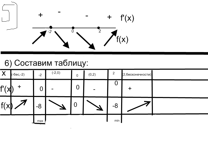 5) Отметим критические точки на числовой прямой и определим знак производной на каждом интервале: