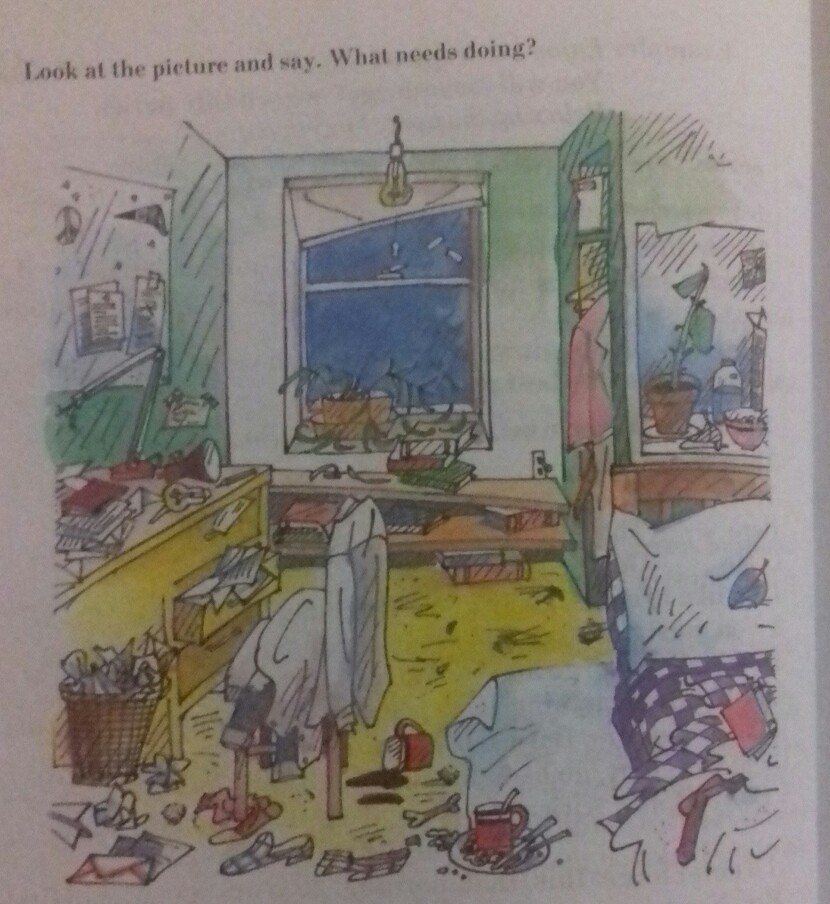 На переднем плане здесь не застеленная кровать, грязная посуда и куча мусора. Поэтому это, возможно, ученик, у которого много домашнего задания, и он слишком ленивый.