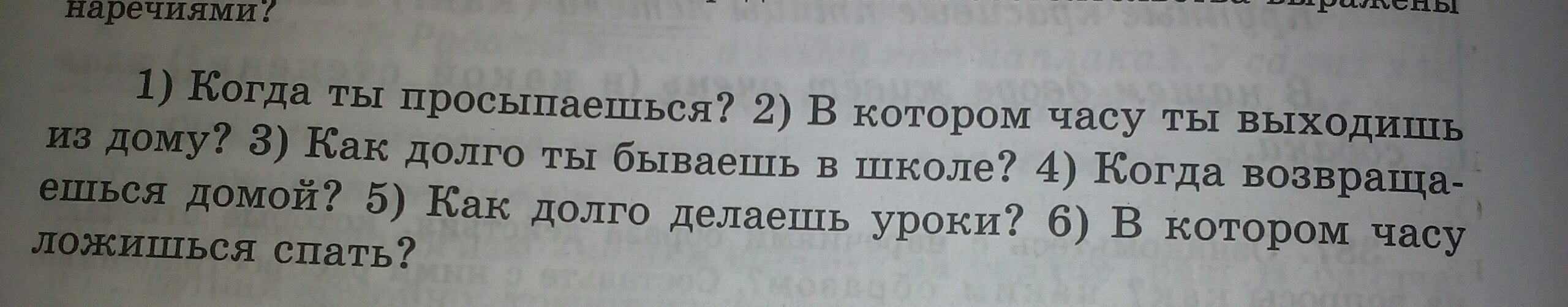 1)Когда(обстоятельство выр наречием) ты (подлежащее выр.местоимением) просыпаешься(сказуемое выр. глаголом).2) В котором(определение выр. прилагательным с предлогом ) часу(дополнение выр. существительным) ты(подлежащее выр. местоимением) выходишь(сказуемое выр. глаголом) из дому(обстоятельство выр. наречием с предлогом).3)Как долго(обстоятельство выр. наречием) ты бываешь(подлежащее выр. местоимением) в школе(дополнение выр существительным с предлогом). 4) Когда(обстоятельство выр. наречием) возвращаешься (сказуемое выр. глаголом) домой(обстоятельство выр. наречием). 5) Как долго(обстоятельство выр. наречием) делаешь(сказуемое выр. глаголом) уроки(дополнение выр. существительным). 6) В котором(определение выр. прилагательным с предлогом) часу(дополнение выр. существительным) ложишься спать (сказуемое выр. глаголом) .