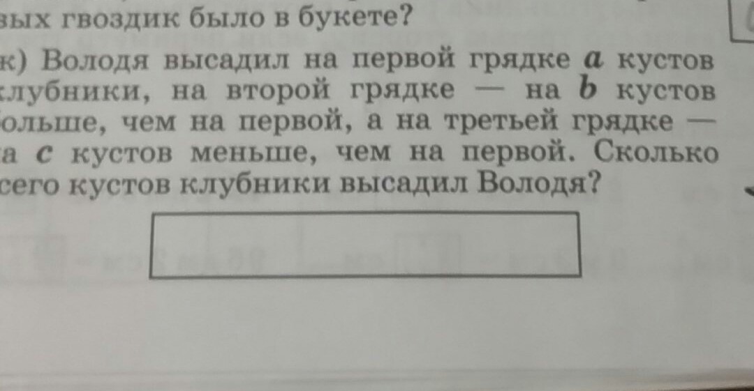 БЛИЦтурнир Володя высадил на первой грядке а кустов клубники на второй грядке на b кустов больше чем на первой а на третьей грядке на с кустов меньше чем на первой сколько всего кустов клубники высадил Володя