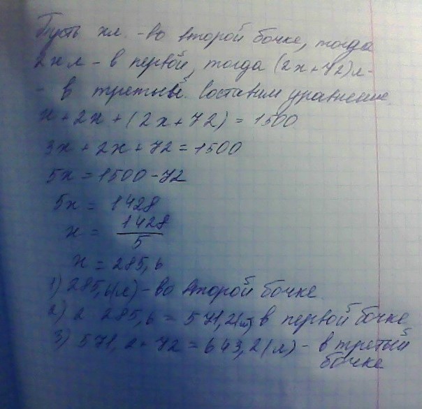 Решите задачу ! В трёх 1500 л кваса, Причём в первый бочке в два раза больше, чем во второй ,а третьей на 72 л больше ,чем в первый. Сколько классов было в каждой бочке