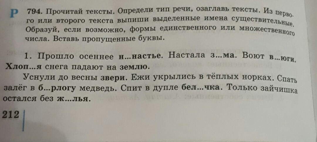 определи тип речи озаглавь тексты из первого или второго текста выпиши выделенные имена существительные образуй если возможно формы ед.ч или мн.ч н...настье з...ма хлоп...я землю бел...чка звери б...рлогу ж...лья