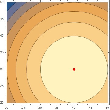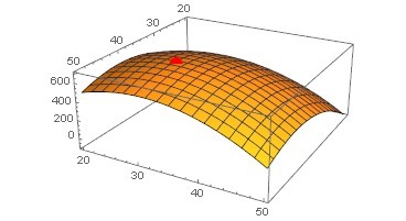 Первый элемент <0, а определитель матрицы H >0, следовательно стационарная точка x=40, y=30 является локальным максимумом.