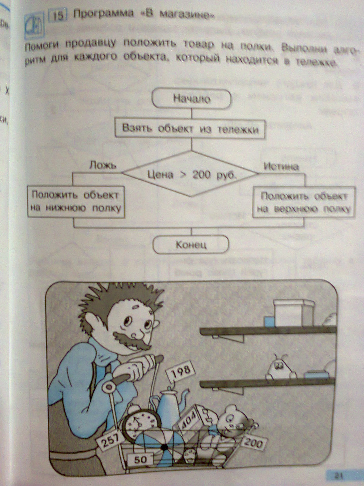 Из тележки товар с ценником 50 попадет на верхнюю полку, остальные на нижнюю т. к. условие 200>цены товара подходит только для ценника 50.