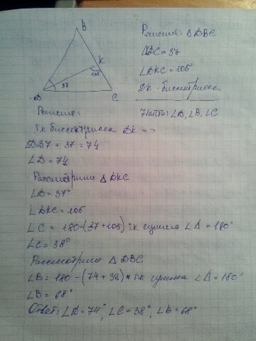 в треугольнике DBC проведена биссектриса DK Определите углы треугольника DBC если угол CDK равен 37 градусов,угол DKC равен 105 градусов