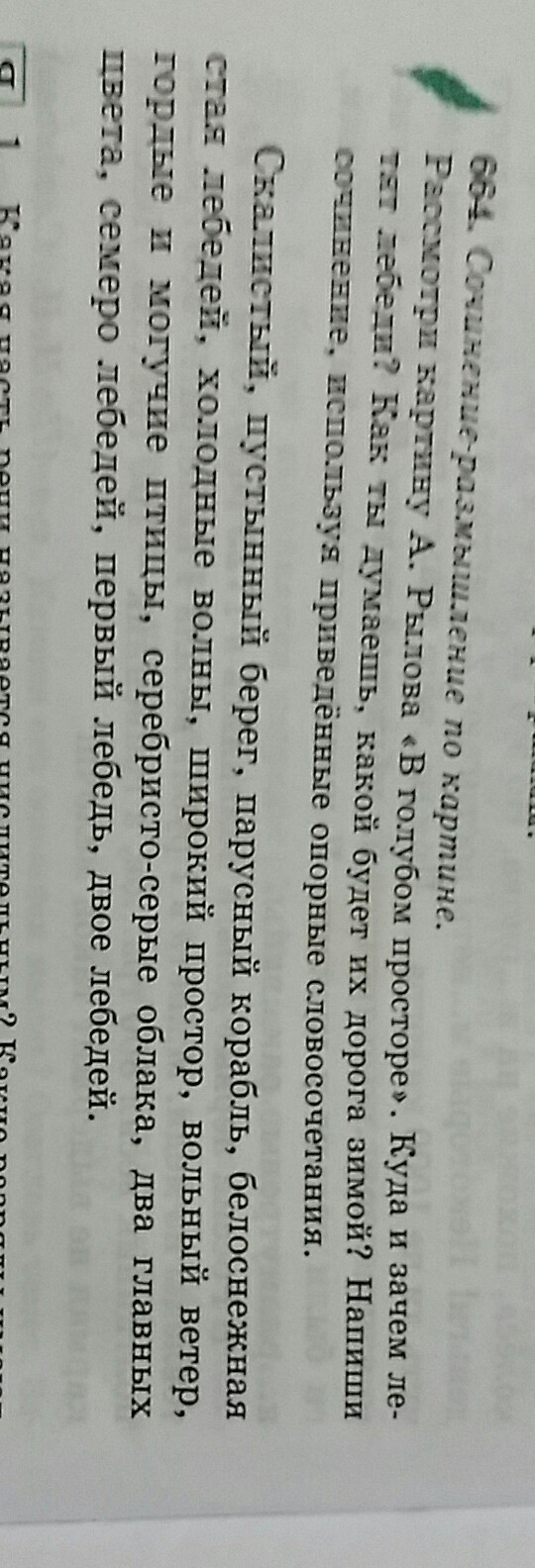 Ясный летний день, солнце высоко в небе, его лучи слепят глаза. На картине изображен бескрайний простор, огромное бездонное синее небо, темное блестящее море, вода в нем переливается под яркими лучами солнца, дует теплый ветер, от этого волны бушуют в море, на их гребнях появилась белая пена. Все полотно картины занимают небо и море. По голубому небу летит стая лебедей. Лебеди летят к солнцу, в теплые края. Солнце освещает их широкие крылья, птицы летят уверенно и свободно по направлению к своей цели. Рядом с ними также быстро летят пушистые легкие перистые облака, они напоминают легкие перышки, которые витают в воздухе. По морю плывет корабль, развеяв свои паруса, он летит по волнам. Его белые паруса, как будто горят под солнечными лучами. На заднем плане мы видим горы, они окутаны снегом, а облака касаются макушек гор. От картины веет соленым и свежим бризом. Главные цвета картины это синий и белый, темно-синим цветом изображается море, а светлым небо, плавный переход цвета отлично передает атмосферу, которую хочет передать художник.