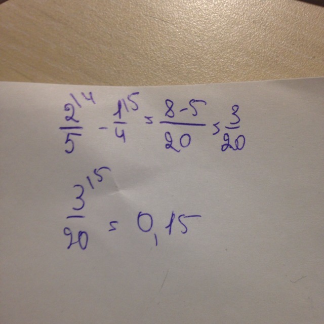 2/5-1/4=2*4/5*4-1*5/4*5=8/20-5/20=8-5/20=3/20=0,15