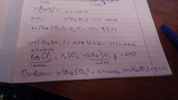 Найдите количество вещества и массу осадка сульфата бария, полученного при взаимодействии 0,4 моль хлорида бария с раствором серной кислоты