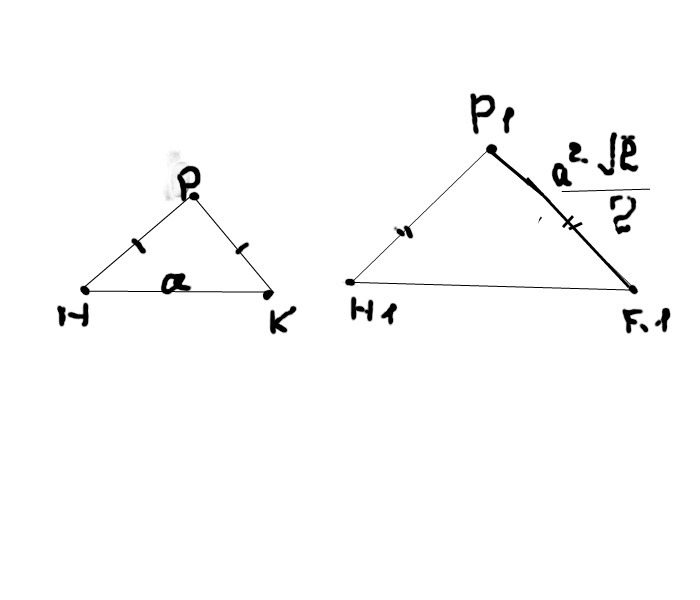 Треугольники НРК и Н1Р1К1 — прямоугольные, равнобедренные. Гипотенуза одного треугольника равна а, катет другого равен а²√2 дробь 2.Определите признак подобия и коэффициент подобия треугольников.