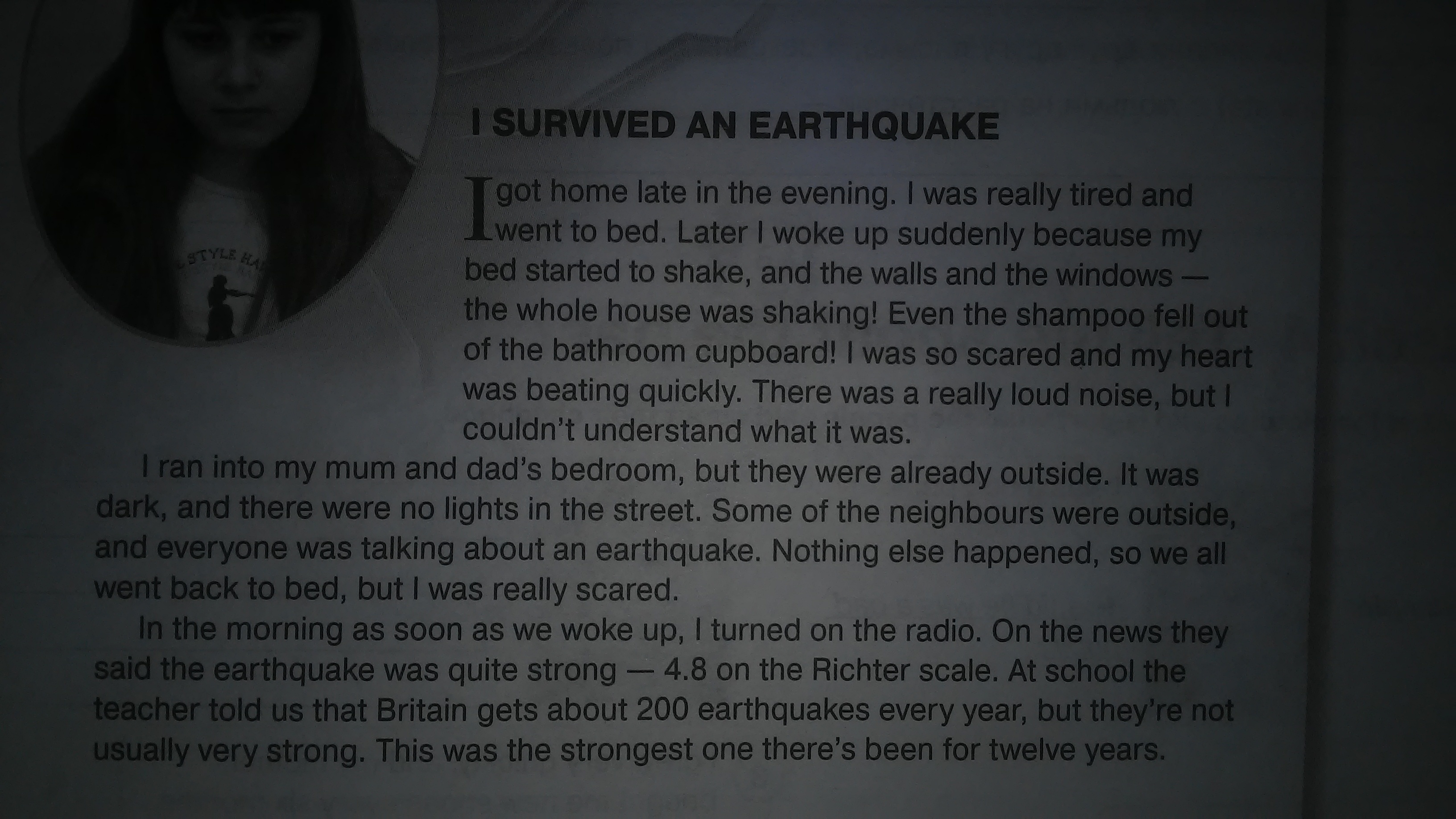 Утром. как только я проснулась я включила радио. В новостях говорили что землетрясение было силой 4.8 по шкале рихтера. В школе учительница рассказала нам, что в Великобритании землетресения бывает 200 раз в году, но обычно они не такие сильные. Эта была самая сильная за 12 лет.