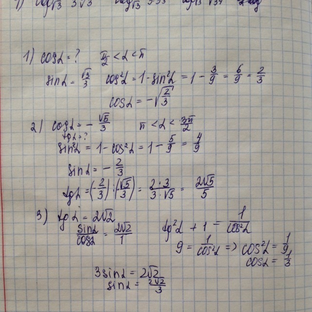 Помогите решить найти 1) cos a , если sin a=√3/3 , пи/2<а<пи 2)tg a , eсли cos a=-√53 , пи<а<3пи/2 3)sin a , если tg a=2√2 , 0