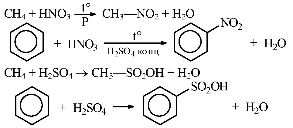 Бензол проявляет непредельный характер только при создании особых условий, а при обычных условиях он не реагирует с водородом, галогенами, но вступает в реакции нитрования и сульфирования.