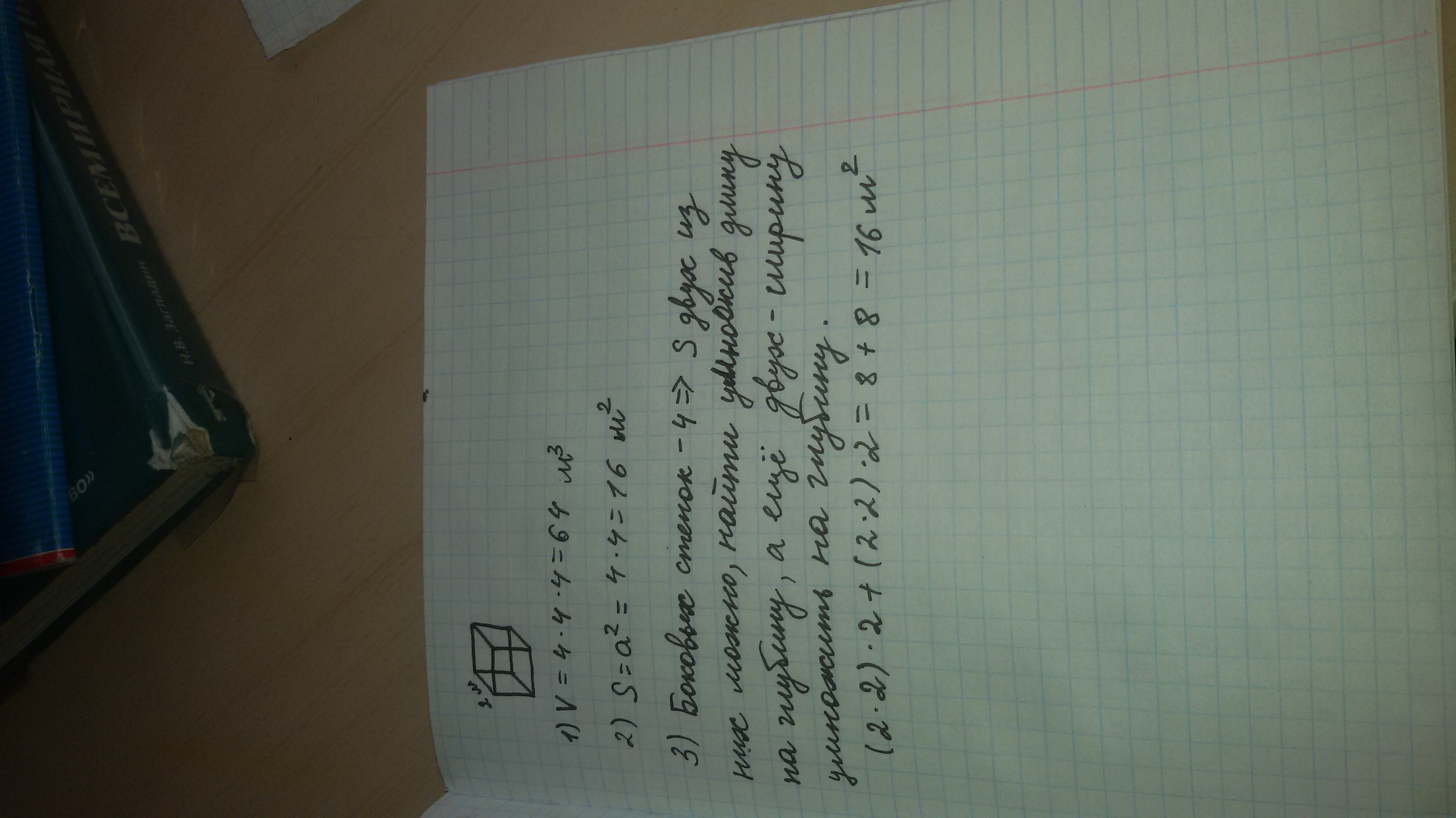 Вычисли объём бассеина в форме куба с ребром 2 м. Вычисли площадь дна этого бассеина. Вычисли сумму площадей боковых стенок этого бассеина.