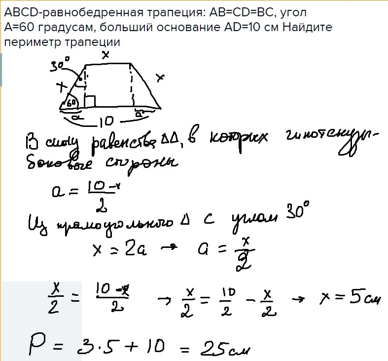 ABCD-равнобедренная трапеция: AB=CD=BC, угол А=60 градусам, больший основание АD=10 см Найдите периметр трапеции