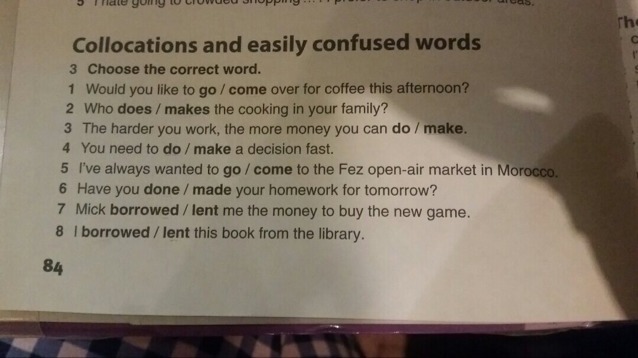 1 come over 2 does 3 make 4 make 5 go 6 done 7 lent 8 borrowed