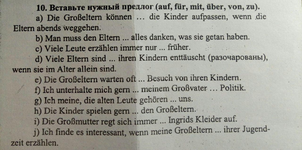 1)auf 2)fur 3)von 4)von 5)auf 6)mit, über 7)zu 8)mit 9)über 10)von