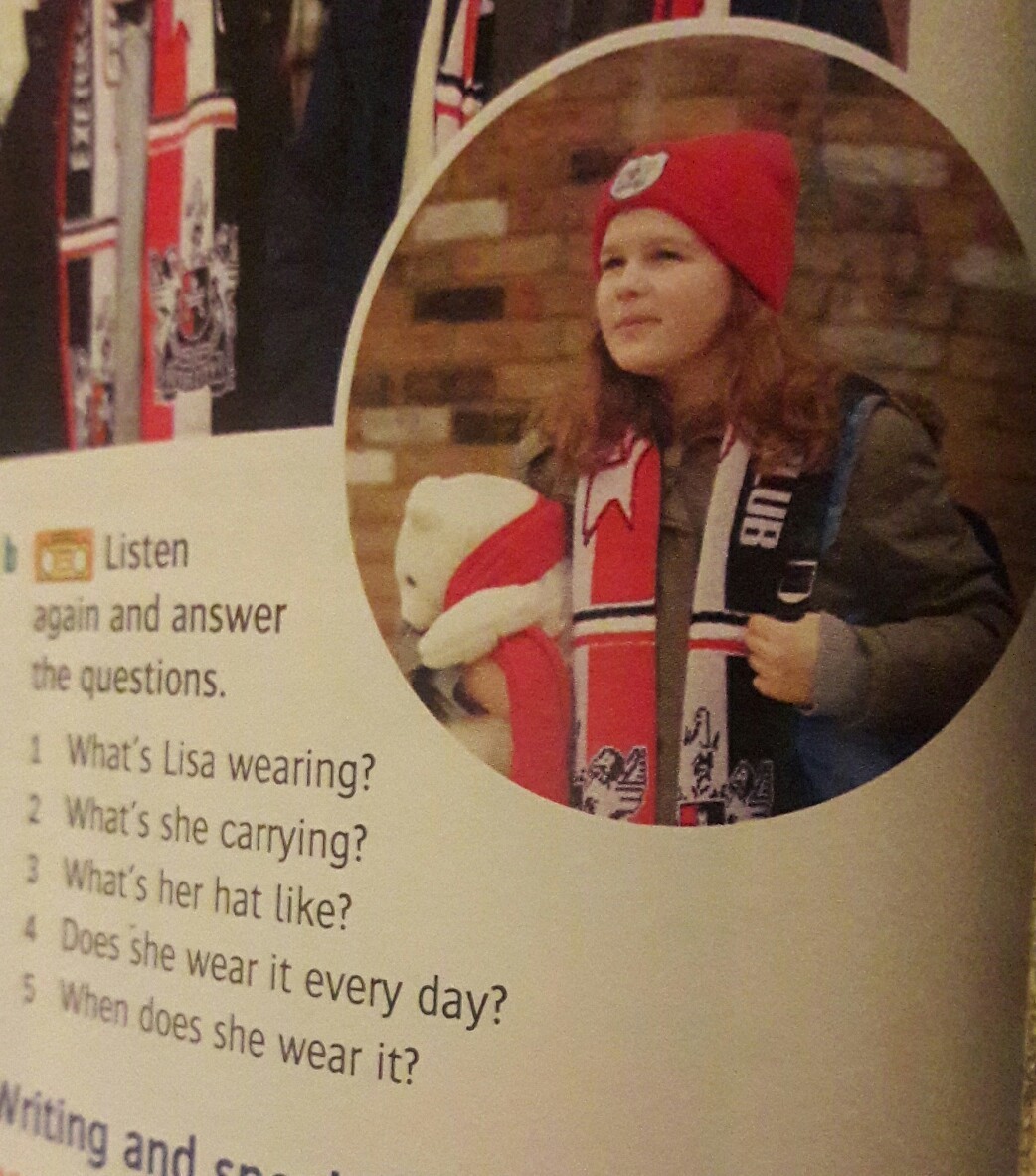 во что одета Лиза?(ответ-Lisa is wearing a red hat with a symbol on it , dark green jacket and colourful scarf.)