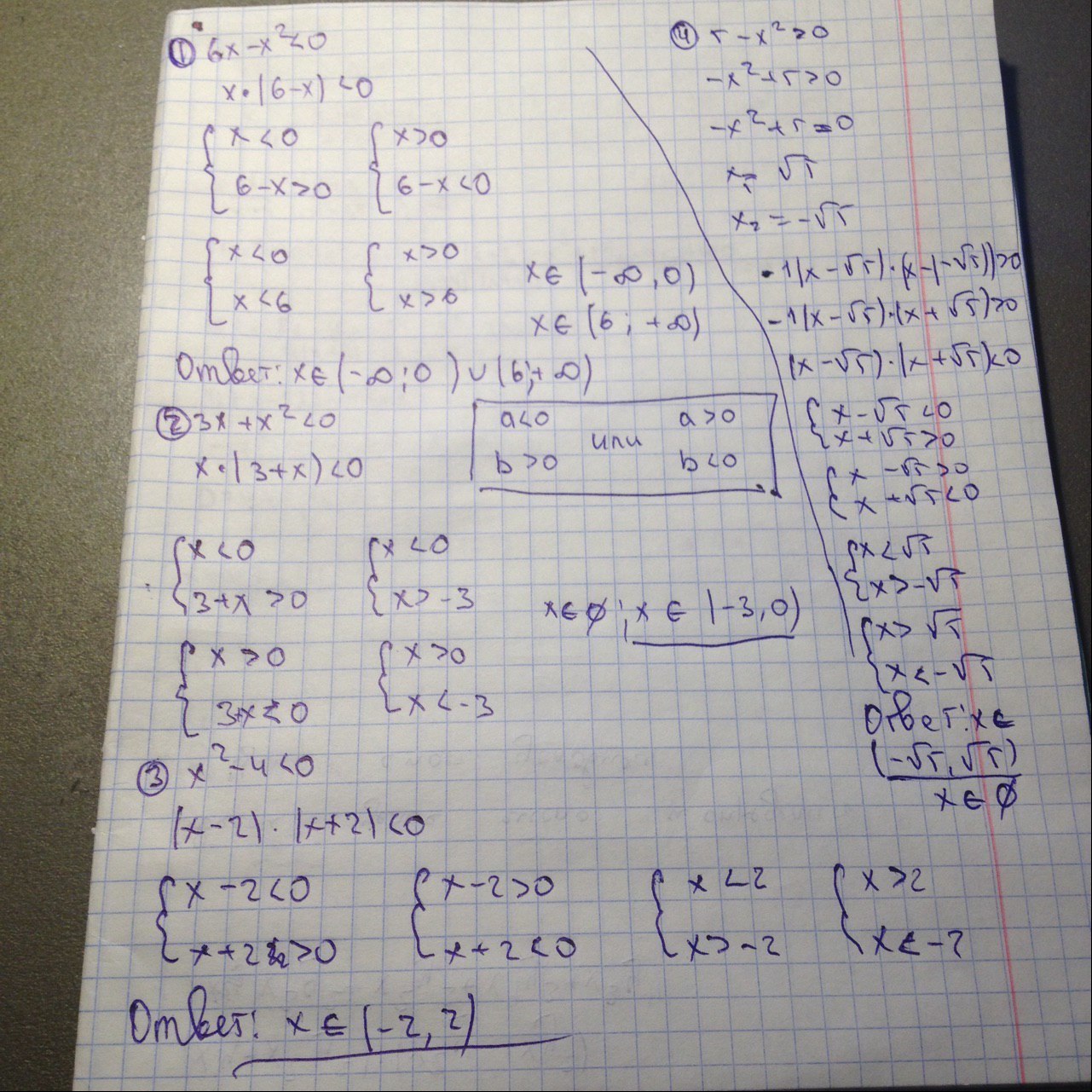 Найдите все целые числа, удовлетворяющие неравенству:1)6х-х^2>0; 2)3х+х^2<0; 3)х^2-4<0; 4)5-x^2>0