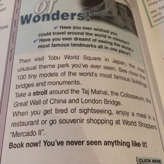 Тейк е строл ероунд зе тадж махал зе колосеум зе грит вол оф чина енд лондон бридж . Вен ю гет тайред оф сигтсеинг енжой е меал ин е рестаурант ор гоу сувениар шопинг ат ворлдс шоперс меркадо ии.