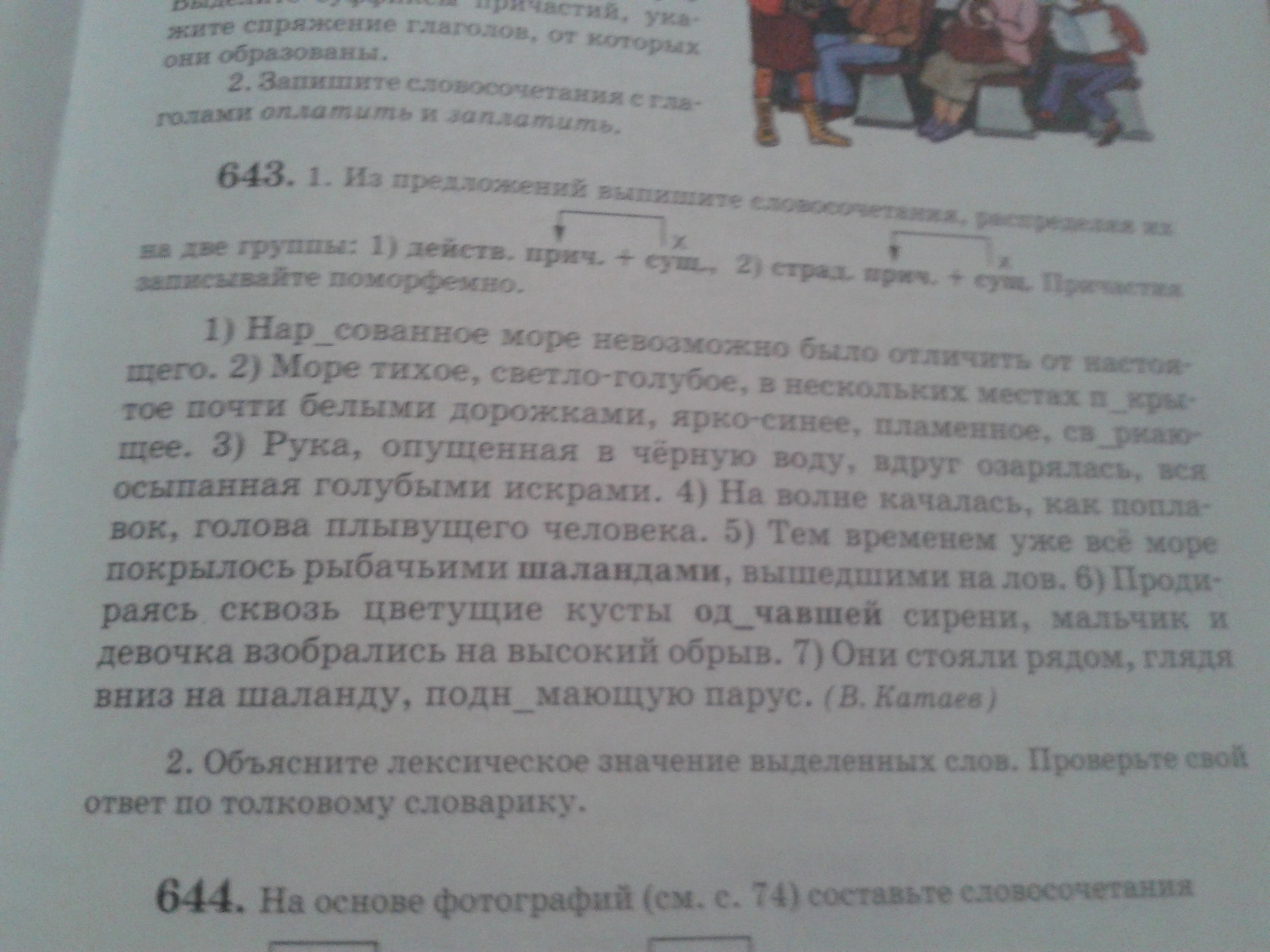 Действительное причастие+сущ: сверкающее море, плывущий человек, вышедшие шаланды, цветущие кусты, поднимающая шаланда.