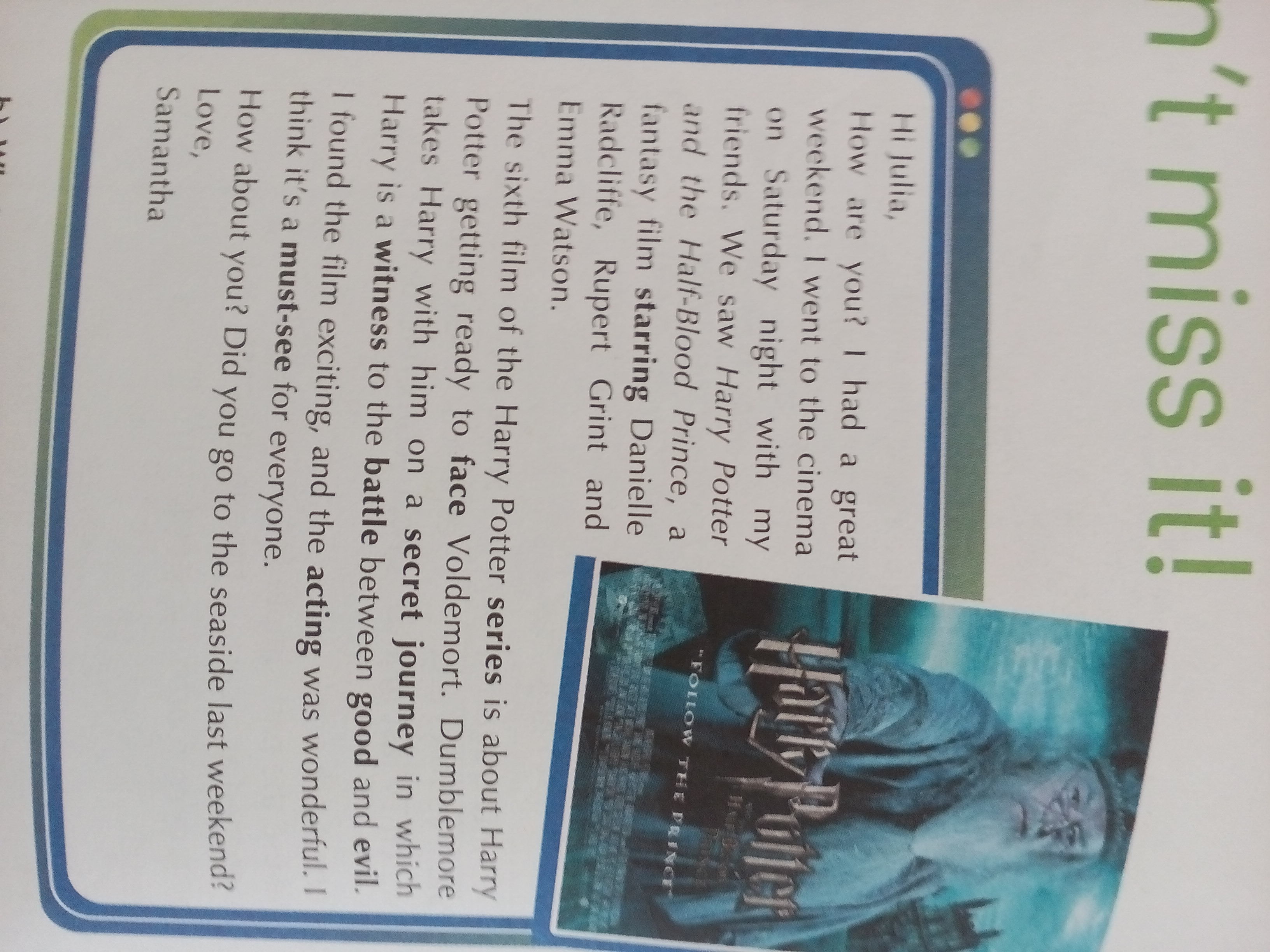 как у тебя дела? у меня были отличные выходные. я ходила в кино в субботу вечером с моими друзьями. мы посмотрели фильм "Гарри Поттер и Принц Полукровка", главные роли там играют Дэниел Рэдклифф, Руперт Гринь и Эмма Уотсон. В шестой части Гарри Поттера Гари Поттер готовиться сражаться с Волан-де-Мортом. Дамблдор берет Гарри с собой в секретное путешествие, где Гарри становится свидетелем битвы между добром и злом. я думаю что фильм отличный и сцены сражения были восхитительными. я думаю, каждый обязан посмотреть этот фильм.