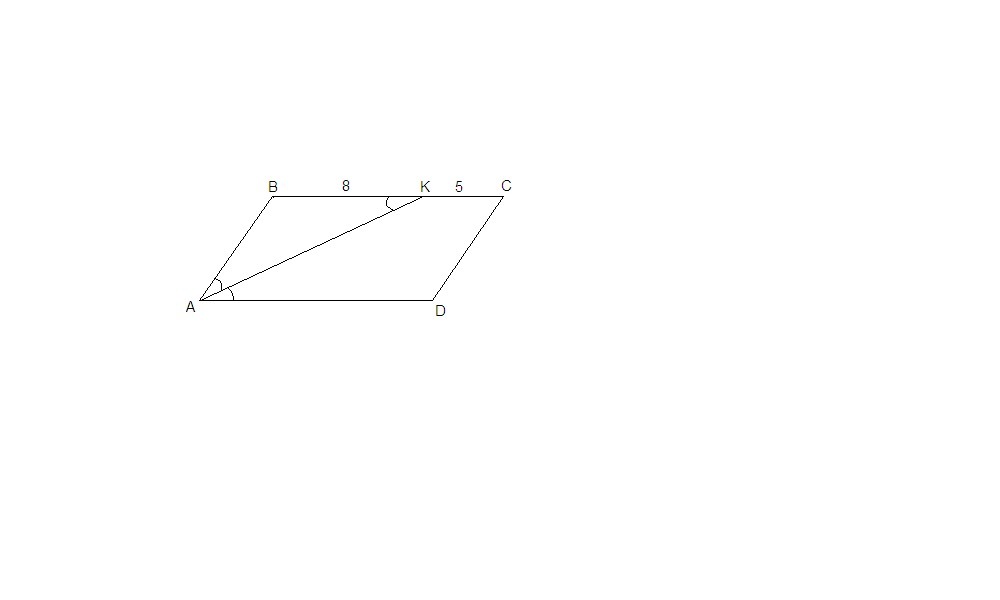 В параллелограмме ABCD биссектриса острого угла A делит противоположную сторону BC на отрезки BK=8 и KC=5. Найдите пермиетр параллелограмма ABCD