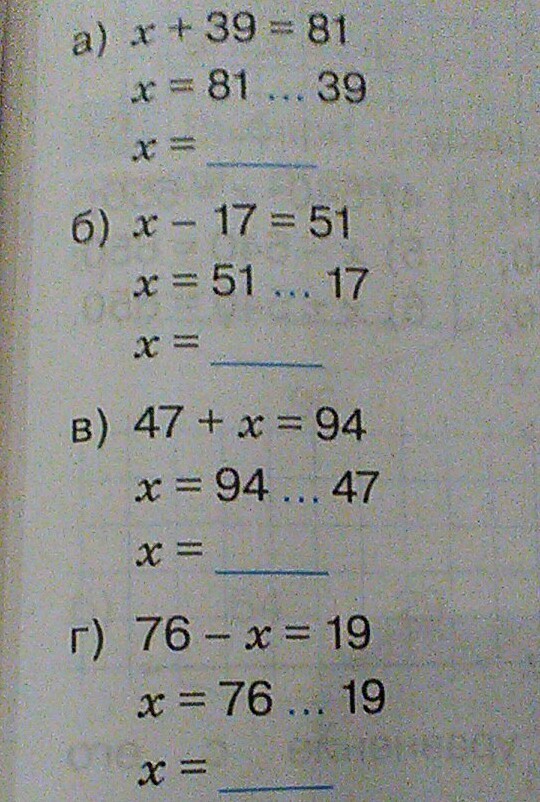 напиши пропущенный знак действий и закончи решение каждого уравнения (надо сделать только а и г )